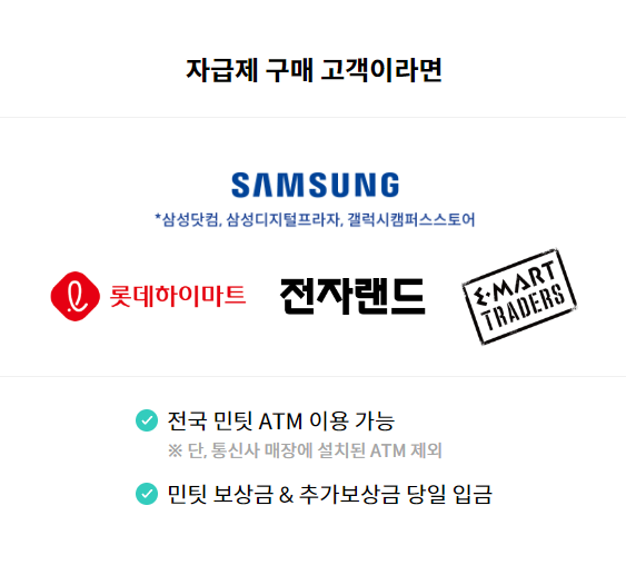 민팃은 편리하고 신괴라는 중고 ICT 기기 플랫폼입니다. ATM을 이용해 편리한 비대면 중고폰 거래가 가능한 점이 특징으로 가까운 통신사 대리점이나 대형마트, 삼성 디지털플라자, 롯데하이마트, 전자랜드 등 다양한 곳에 설치된 전용 ATM기기를 통해 중고폰을 쉽게 판매하거나 기부가 가능한 서비스입니다.