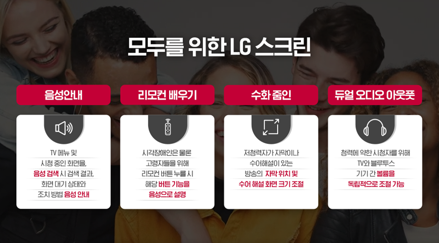 모든 사용자를 고려한 LG 올레드 TV의 기술력도 빼놓을 수 없습니다. TV 메뉴 및 시청 중인 화면을 음성검색 시 검색 결과를 음성으로 들려주고, 화면 대기상태와 조치 방법에 따른 음성안내도 제공됩니다. 시각 장애인과 고령자를 위한 리모컨 배우기 기능과 저청력자가 자막이나 수어 해설이 있는 방송의 자막 위치 및 수어 해설 화면 크기 조절이 가능하며, 청력이 약한 시청자를 위한 TV와 블루투스 기기간 볼륨을 독립적으로 조절하는 듀얼 오디오 아웃풋 기능도 추가되었습니다.