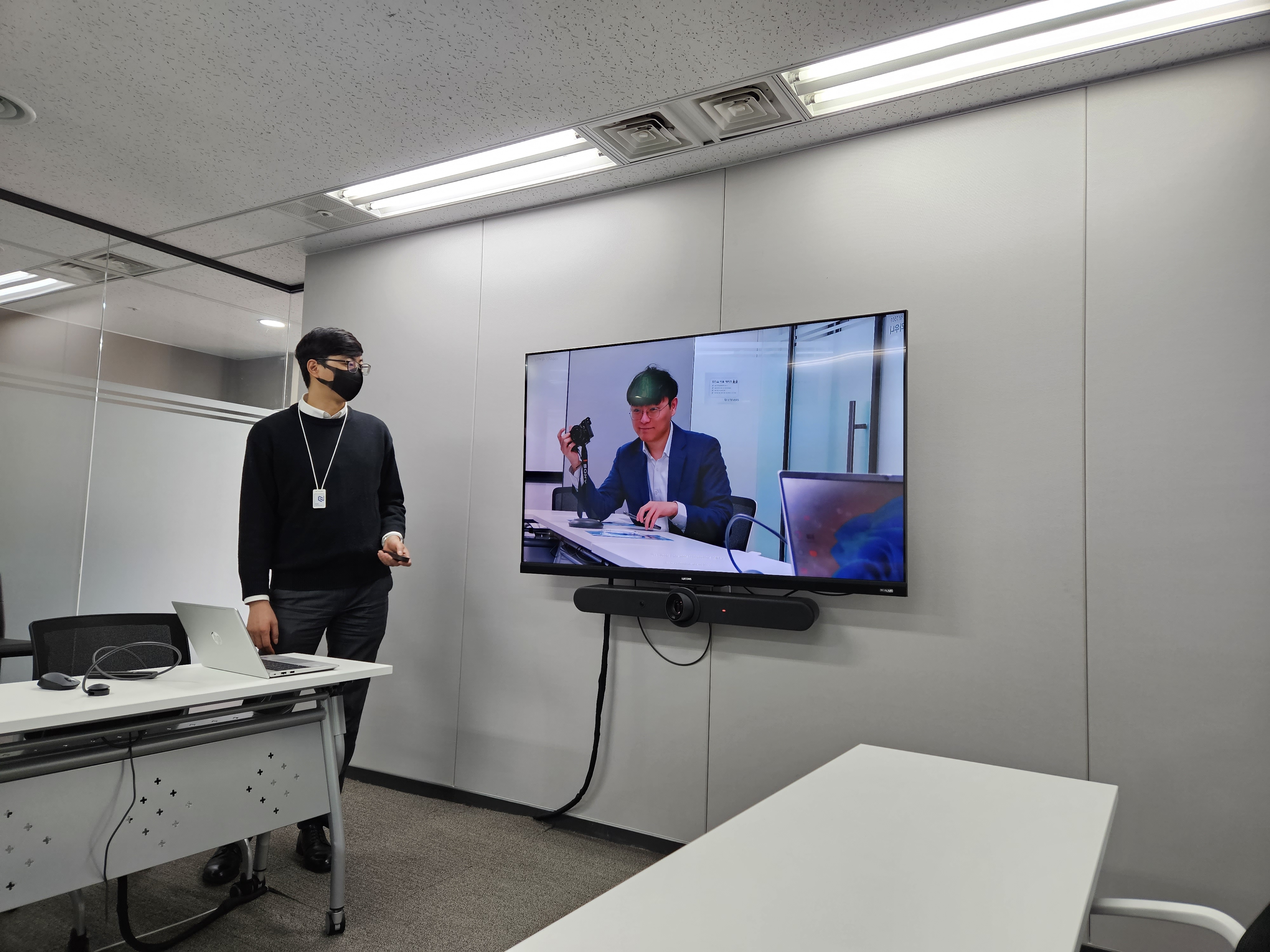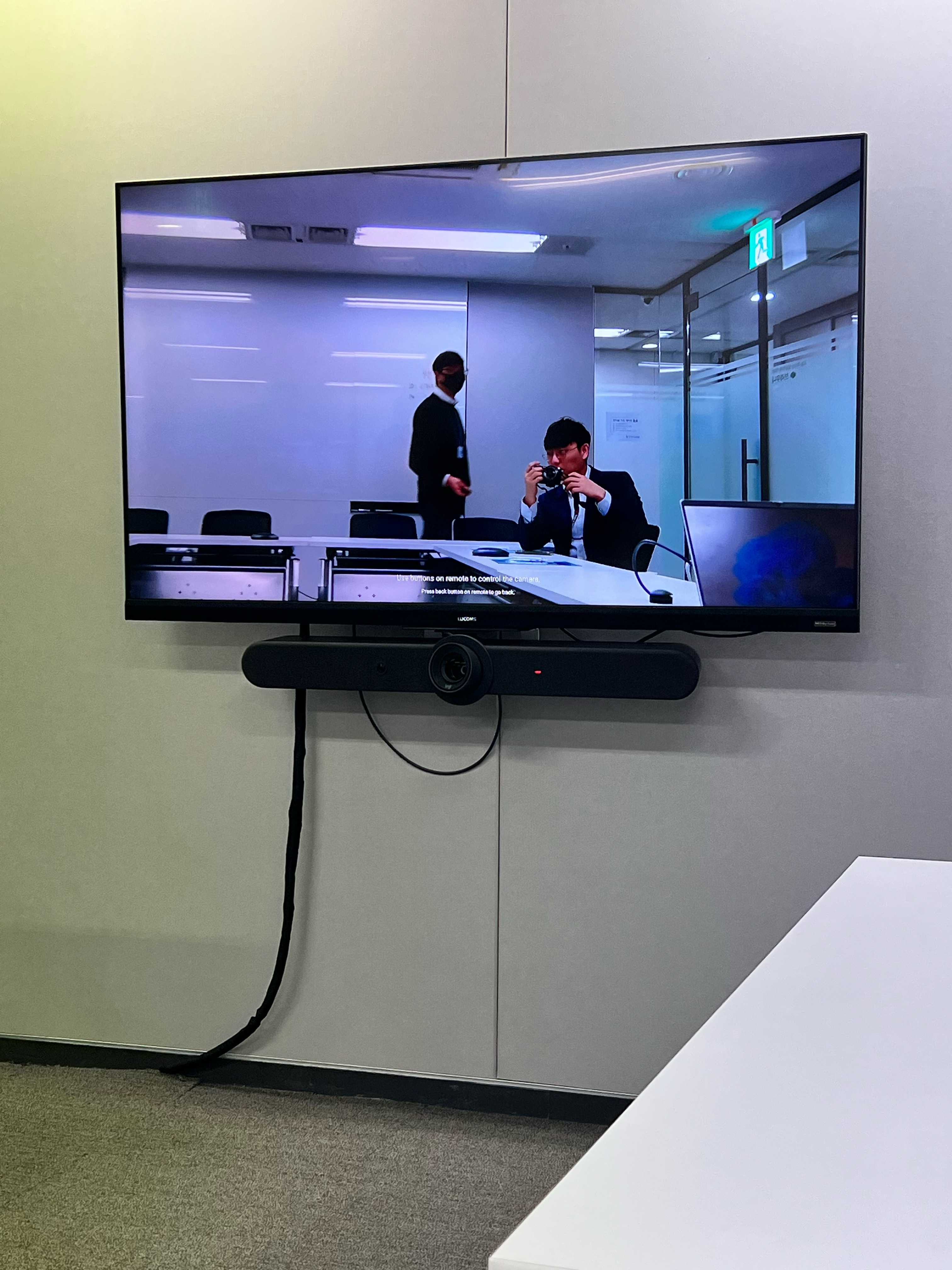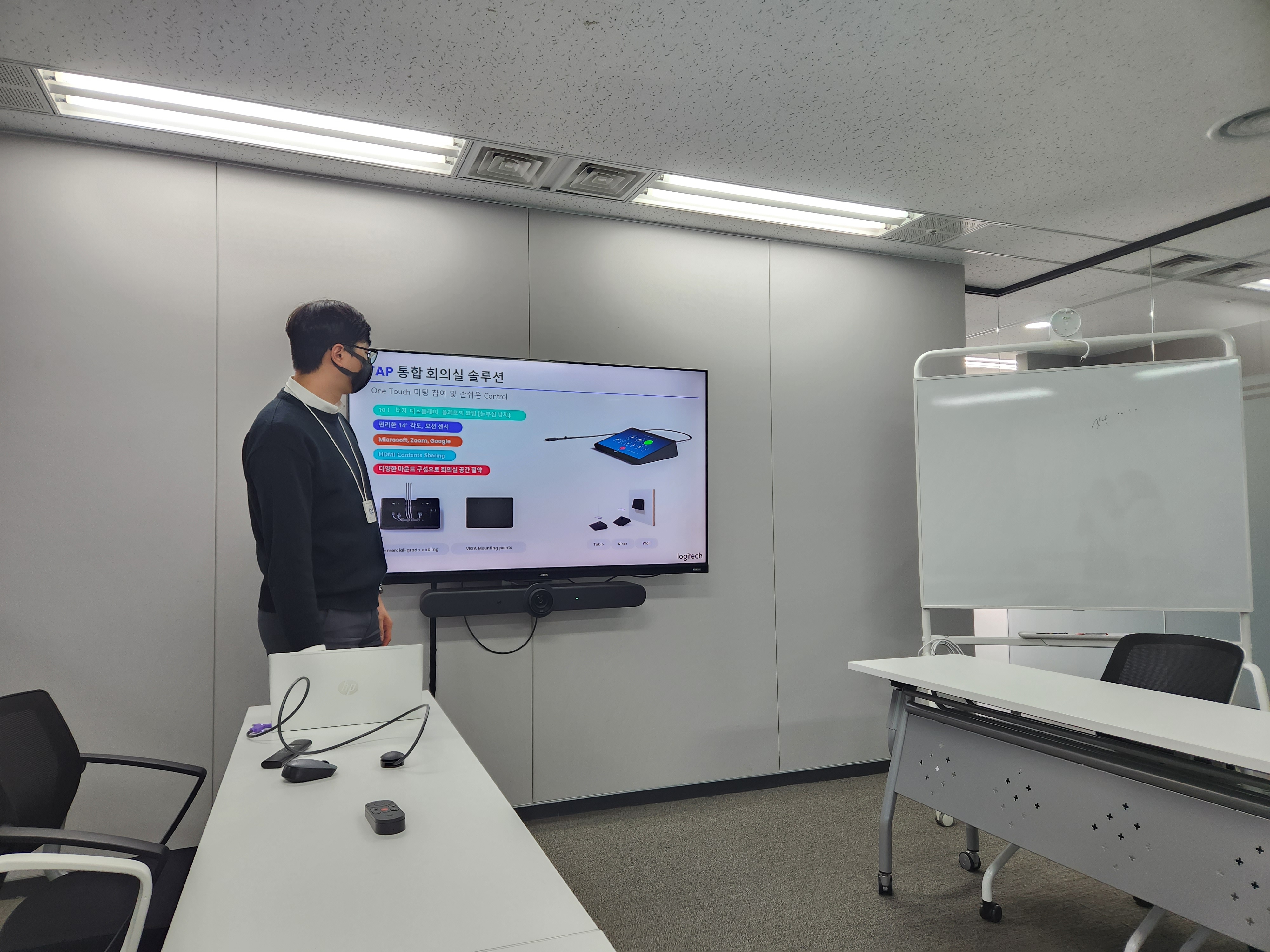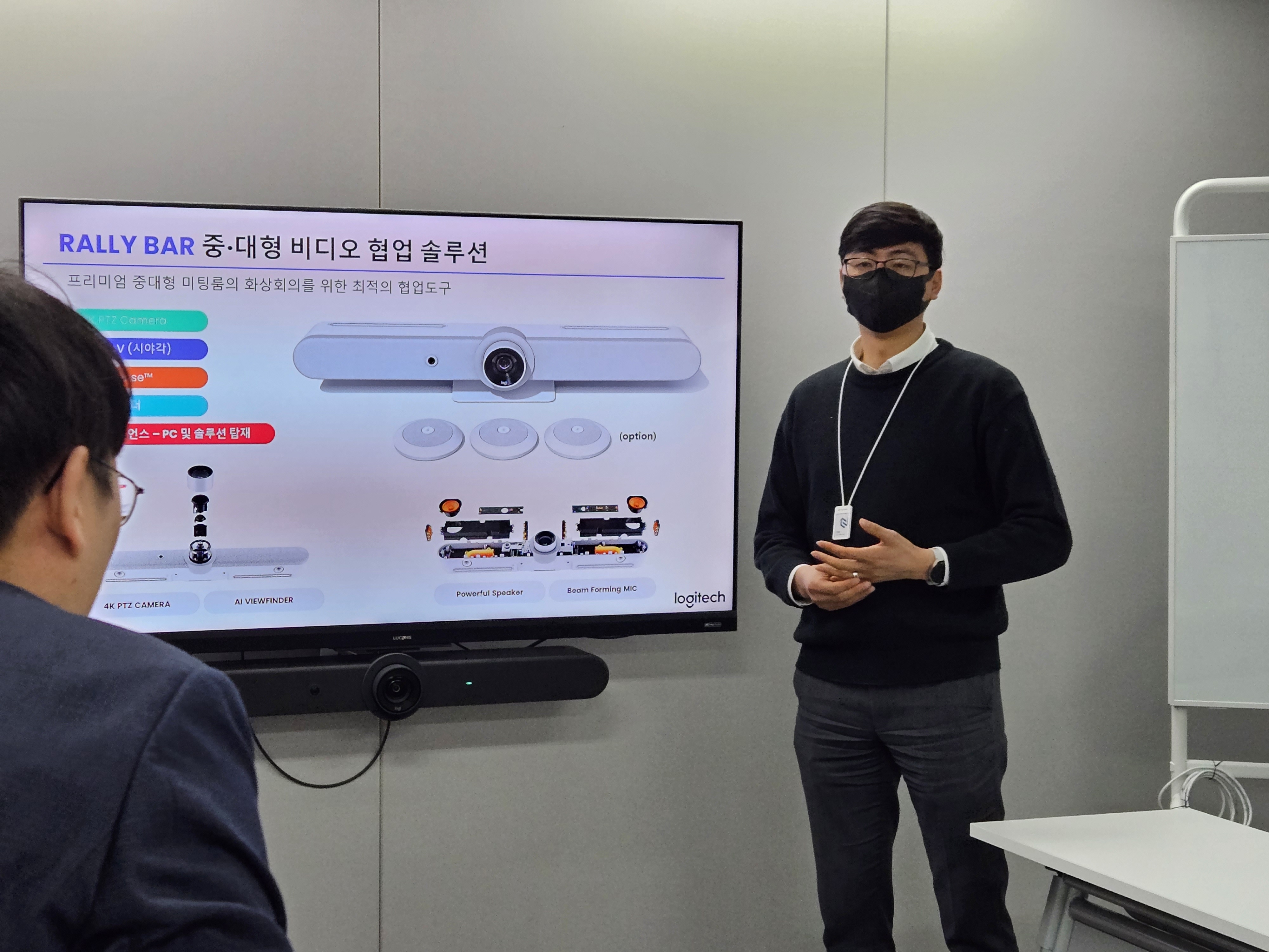 제품에 대한 상세한 설명과 시연이 끝나고, 제품을 보다 자세히 확인할 수 있었습니다. 제품 성능도 좋지만 디자인도 트랜디하면서도 세련되어 사무실이나 집 등 어느 공간에도 부담 없이 설치할 수 있을 정도였습니다. 화상회의에서 중요한 화질과 음성을 담당하는 카메라 화질도 좋고, 음질 부분도 흠잡을 곳 없어 역시 로지텍이라는 말이 나오더군요.