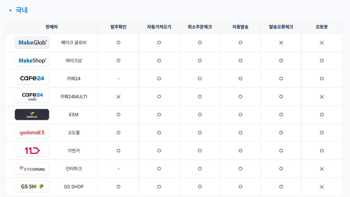 셀메이트로 관리할 수 있는 쇼핑몰의 수는 쇼핑몰 플랫폼을 떠올리면 생각나는 대부분의 국내 판매처와 해외 판매처까지 연동되어 있는데요, 발주확인/ 자동 가져오기/ 취소 주문체크/ 자동 발송/ 발송오류체크/ 오토봇 기능까지 대부분 구현되어 있는 점이 특징입니다.