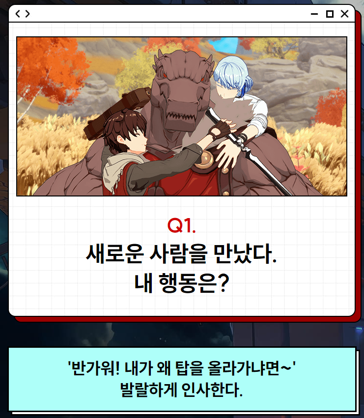 내가 신의탑 캐릭터라면 누구와 가장 닮아있는지에 대한 테스트도 준비되어 있어 가볍게 참여할 수 있습니다. 직접 탑에 오른다고 생각하고 질문에 대한 대답을 선택하는 방식으로 진행되는데요, 테스트 결과 사교적인 탐색꾼 십이수가 등장해 조금 놀랐습니다. 본인에게 가장 어울리는 캐릭터가 누구인지 궁금하다면 잊지 말고 테스트에 참여해 보세요!