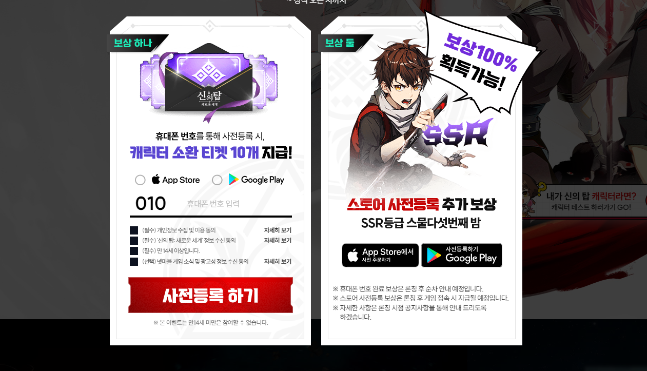 정식 출시를 기다리는데 있어 사전예약은 필수이겠죠? 넷마블 기대작 신의탑 새로운 세계 사전예약은 정식출시 전까지 진행되며, 휴대폰 번호를 통해 사전등록에 참여한 모든 유저에게는 캐릭터 소환 티켓 10개가 주어집니다. 여기에 스토어 사전등록을 추가로 진행하면 SSR등급 스물다섯 번째 밤까지 획득할 수 있습니다.