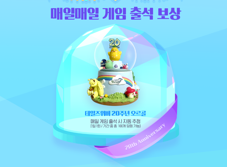 출석체크를 통해 당첨여부를 바로 확인할 수 있는 테일즈위버 20주년 오르골은 공식 유튜브 쇼츠를 통해 보다 자세히 확인할 수 있습니다. 테일즈위버 캐릭터들이 옹기종기 모여 있는 오르고 디자인은 많은 유저들의 소장욕을 자극할 정도로 갖고 싶다는 목소리가 높은 만큼 출석체크 이벤트를 놓치지 말고 참여해 행운의 주인공이 될 수 있는 기회를 잡아보시기 바랍니다.