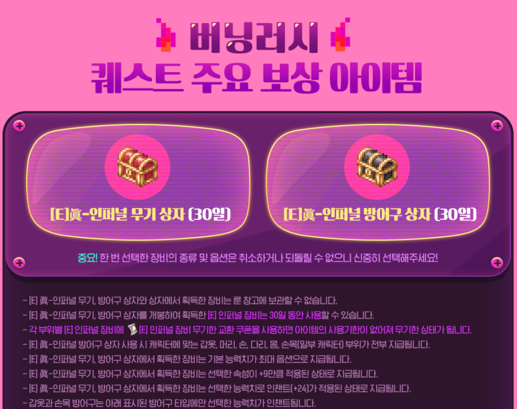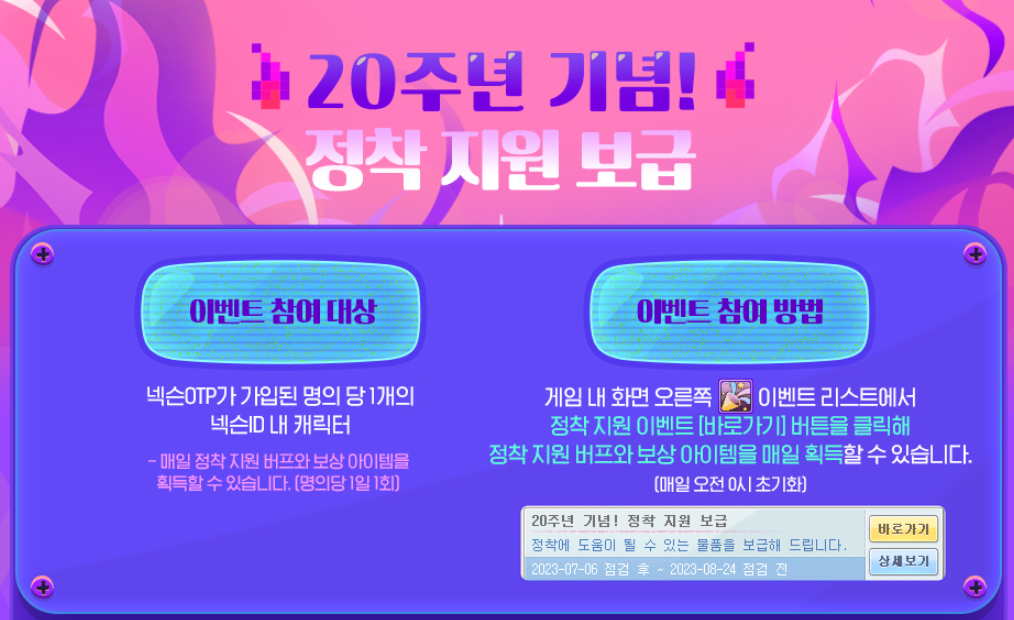 캐릭터 성장을 도와주는 버프 혜택도 어마어마 하지만, 퀘스트 보상으로 주어지는 무기와 방어구가 캐릭터 육성에 상당한 도움이 되기 떄문입니다. 이외에도 20주년 기념 정착 지원 보급 이벤트가 함께 진행되어 공격피해량과 피격 피해랑에 도움이 되는 정작 치원 버프를 수령할 수 있으니 놓치지 말고 챙겨보세요!