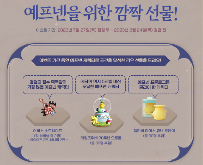 예프넨 업데이트와 함께 특정 조건 달성시 깜짝 선물을 받을 수 있는 이벤트가 진행 중입니다. 8월 24일 정기점검 전까지 예프넨 캐릭터로 특정 조건을 달성하면 어비스 소드 셰이프를 비롯해 테일즈위버 20주년 오르골, 젤리삐 아이스 큐브 트레이 외에 기억의 나뭇가지와 발굴지 증폭 티켓등도 준비되어 캐릭터를 육성하는 재미가 상당합니다.
