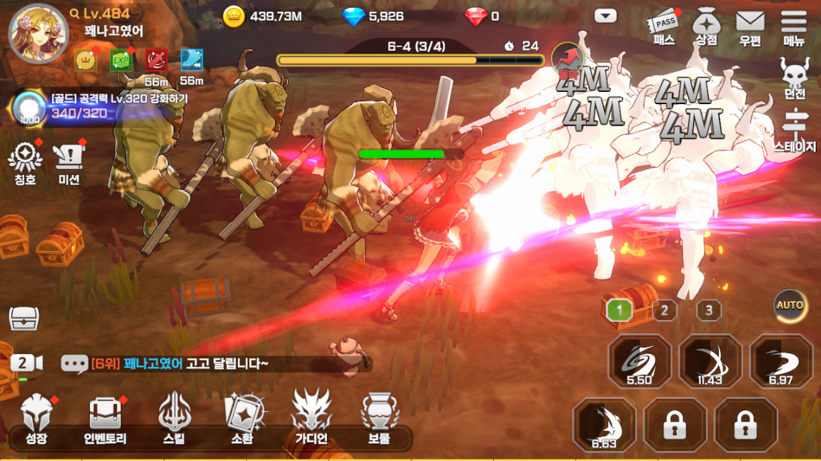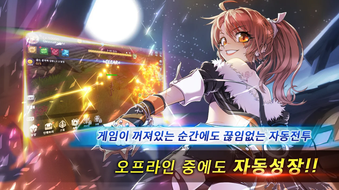 방치형이라 하면 당연하게 생각되는 것 바로 자동전투에 따른 자동성장입니다. 접속중이 아닌 오프라인 상태에서도 끊임없는 전투를 진행하게 되는데요, 이를 바탕으로 지속적인 성장이 이루어진다고 합니다. 덕분에 접속할 때마다 쑥쑥 성장해 있는 캐릭터를 확인하는 즐거움은 덤이라고 할까요?