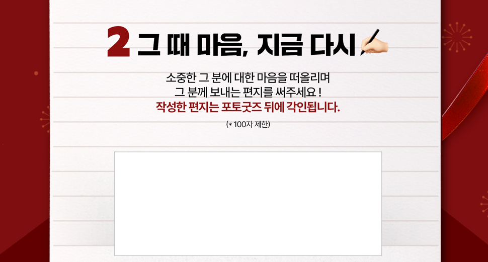 약속을 기재했다면 그때 그 마음을 떠올리며 편지를 작성합니다. 작성한 편지는 포토굿즈 뒤에 각인될 내용인 만큼 꼭 하고 싶었던 말이나, 마음을 전하는 내용이라면 더욱 좋은데요, 100자 제한에 맞춰 작성하는 것이 중요합니다. 불필요한 말들은 잠시 미루고, 꼭 전하고 싶은 내용으로 기재하는게 중요해요.