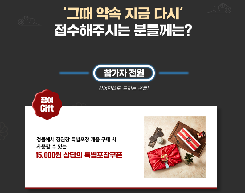 정관장 그때도 지금도, 당신께 만큼은 이벤트의 경우는 8월 30일부터 9월 17일까지 진행됩니다. 참여한 전원에게는 정몰에서 정관장 특별포장 제품 구매 시 사용 가능한 15,000원 상당의 특별포장쿠폰을 지급하는데요, 내용물 만큼 포장에도 신경이 쓰이는 추석 선물인 만큼 참여만 해도 고급스런 포장을 선택할 수 있습니다.
