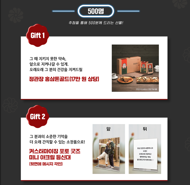 이벤트 참여시 총 500명을 추첨해 지급하는 선물도 특별합니다. 효도하겠다는 약속을 지킬 수 있도록 오래오래 건강을 지켜드릴 정관장 홈삼톤 골드(17만원 상당) 제품과 제출한 사진과 편지를 각인해 소장품으로 만드는 커스터마이징 포토 굿즈 미니 아크릴 등신대 선물이 준비되어 있습니다.