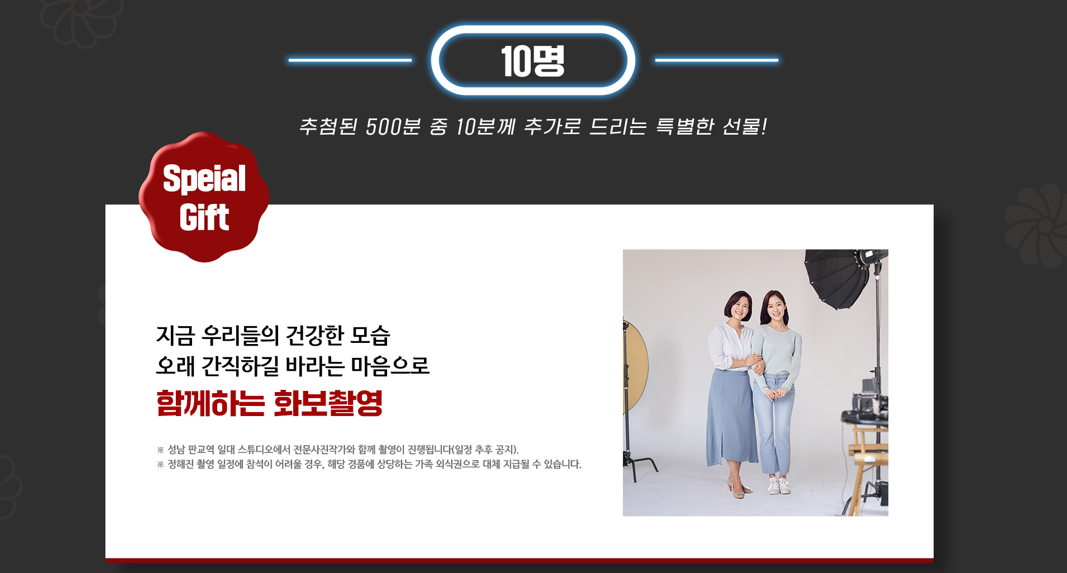 추첨된 500명 중 10명에기는 특별한 선물이 추가되는데요, 지금 모습을 오랜시간 간직할 수 있는 성남 판교역 일대 스튜디오에서 전문 사진작가와 함께 촬영을 진행할 수 있는 화보촬영이 준비되어 있습니다. 부모님께서 건강하신 지금 행복한 모습을 오래오래 간직할 수 있는 만큼 이번 정관장 당신께만큼은 이벤트 참여는 놓치면 아쉬울 듯 합니다.