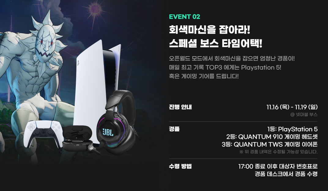 일곱 개의 대죄: 오리진 게임 부스에서 진행되는 이벤트도 풍성합니다. 넷마블 부스에서 시연을 완료하거나, 오픈 월드 모드에서 회색 마신을 잡으면 주어지는 경품도 상당한데요, 무엇보다 매일 최고기록 TOP3에게는 플레이스테이션 5 또는 게이밍 기어등의 선물이 주어집니다.
