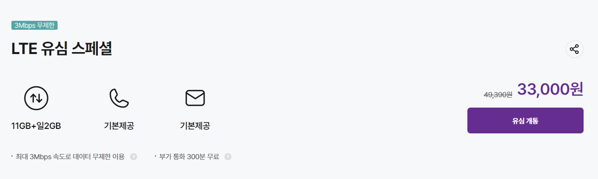 가장 많은 분들이 선택하고 있는 LTE유심 스페셜 요금제의 경우 월 33,000원의 비용으로 11GB 데이터와 일 2GB 데이터 사용이 가능합니다. 음성통화와 문자가 기본으로 제공되어 무제한 이용 가능한데요, 데이터의 경우에도 최대 3 Mbps 속도로 무제한 이용할 수 있어 비용은 낮추고 사용은 그대로 할 수 있는 장점을 가지고 있습니다.