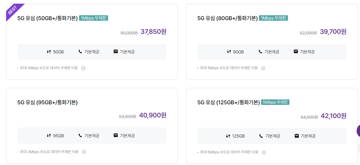 갤럭시 S24 자급제폰과 라이프스타일에 맞춘 유모바일요금제는 LTE와 5G로 구분해 다양하게 준비되어 있는데요, 월 기본으로 주어지는 데이터 용량에 따라 원하는 요금제 선택이 가능합니다. 어떤 요금제를 선택하더라도 데이터 속도의 차이만 있을 뿐 데이터 무제한 이용도 가능합니다.