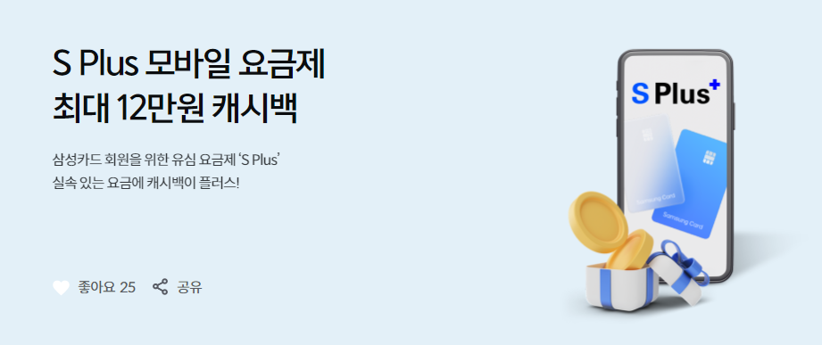월 최대 12만 원의 캐시백을 받을 수 있는 방법도 있습니다. 유모바일과 삼성카드가 제휴해 출시한 SPlus 요금제에 가입하면 최대 12만 원의 캐시백을 수령할 수 있는데요, LTE부터 5G까지 선택이 가능하며 데이터 1G부터 최대 95GB까지 본인의 사용량에 맞는 요금제 선택이 가능해 삼성카드 회원이라면 꼭 확인해 보시는 걸 추천드립니다.