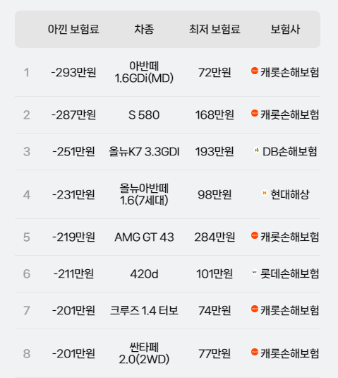 네이버 마이카 보험료 랭킹전에 공개된 상위 10개 차종에 대한 보험료를 살펴보면 1위를 시작으로 최저보험료로 선택된 보험사가 캐롯손해보험임을 확인할 수 있는데요 그만큼 합리적인 비용으로 자동차보험을 가입할 수 있는 확신을 주는 대목인 것 같습니다.