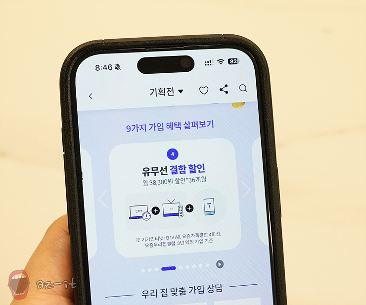 유무선 결합 할인 혜택과 생활 안심 서비스 무료 혜택도 주어집니다. 기가 인터넷+B tv All 기준으로 요즘 가족결합 4회선, 요즘 우리 집 결합 3년 약정 기준 월 38,300원 할인을 36개월 즉 약정 기간 동안 받을 수 있습니다. 생활 안심 서비스의 경우 금융 사기 피해 보상 지원 또는 TV 수리 보상 서비스 중 하나를 선택 지원받을 수 있어 생각지 못한 상황을 대비할 수 있기도 합니다.
