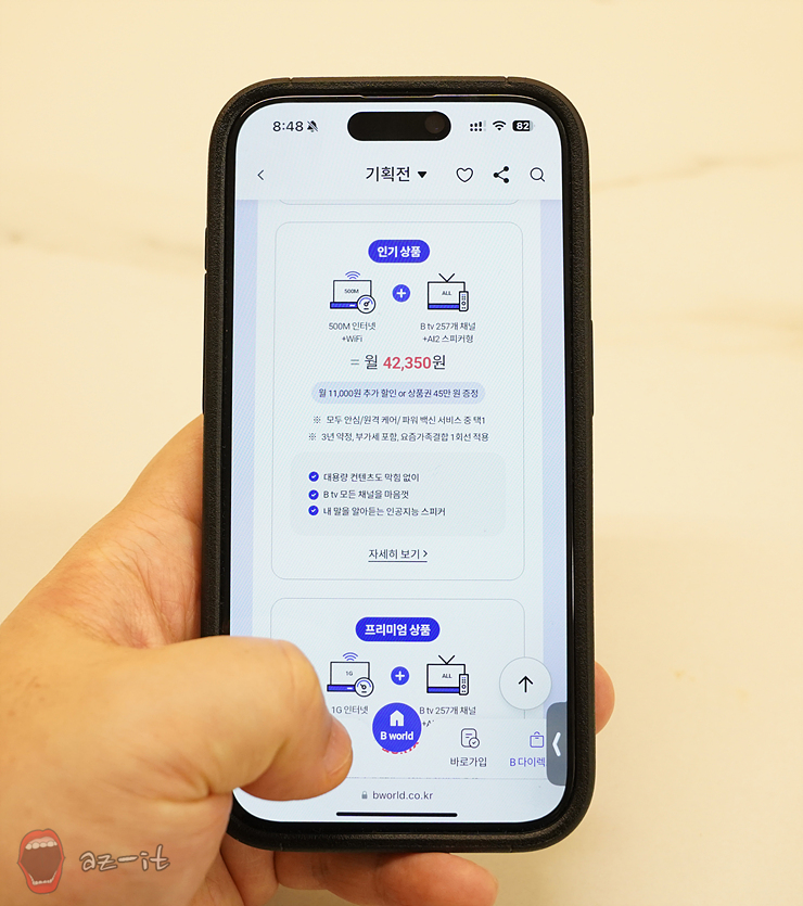 고사양 게임을 즐기거나 Btv 모든 채널을 마음껏 이용하고 싶은 분들이라면 프리미엄 상품이 적당합니다. 1G 인터넷과 와이파이 그리고 B tv 257개 채널 및 AI2 스피커가 제공됩니다. 인기상품 선택 시 제공되는 혜택도 동일하게 받을 수 있는데요, 인터넷 속도 신경 쓰지 않고 원하는 채널을 원하는 만큼 시청하기에 안성맞춤입니다.