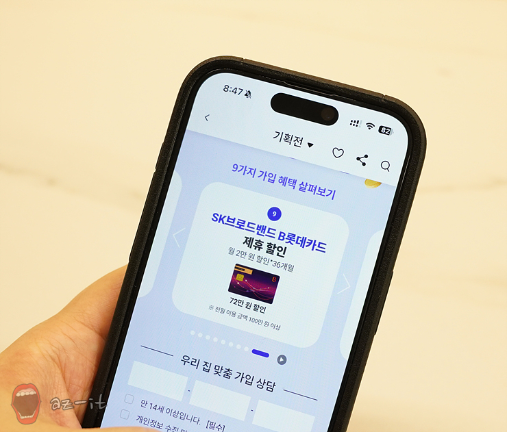 월정액 12종 1개월 무료와 B캐쉬 1만 점이 포함된 웰컴 미디어팩도 가입 시 수령 가능하고, SK브로드밴드 B롯데카드 제휴 할인을 통해 월 2만 원씩 36개월 동안 72만 원 할인을 받을 수 있습니다. B다이렉트 샵을 통해 인터넷티비결합 가입만 하면 이 모든 혜택을 다 받을 수 있으니 정말 놀랍지 않나요?