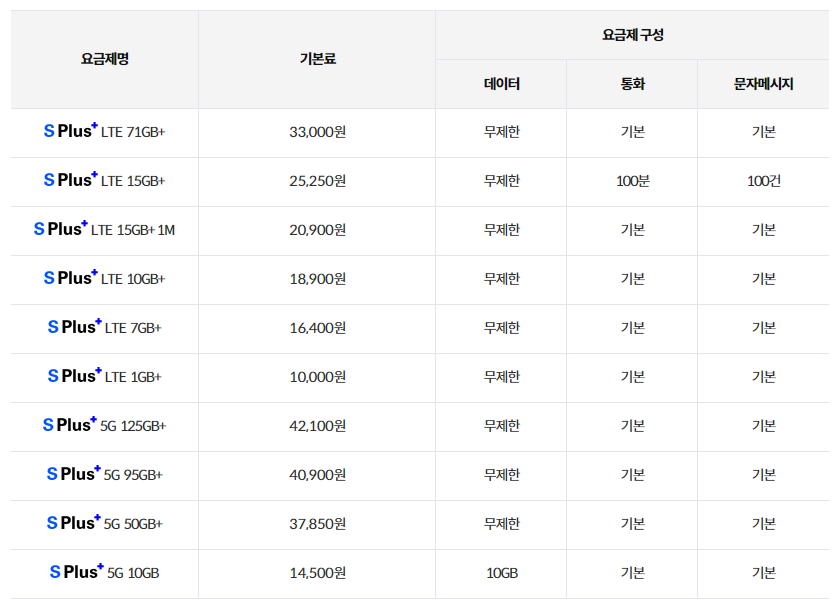 S Plus 요금제는 총 10개로 구성되어 있어 본인에게 맞는 요금제 선택이 가능합니다. 보통 많은 분들이 가입하는 7GB+ 또는 10GB+ 요금의 경우 캐시백 혜택을 받으면 7GB+ 요금제는 6,400원, 10GB+ 요금제는 8,900원으로 1만 원 이하 비용으로 이용 가능해 합리적입니다. 무엇보다 1GB+ 요금제를 선택하면 0원으로 이용할 수 있어 자녀요금제로 고민 중인 분들에게는 희소식이 아닐까 싶습니다.
