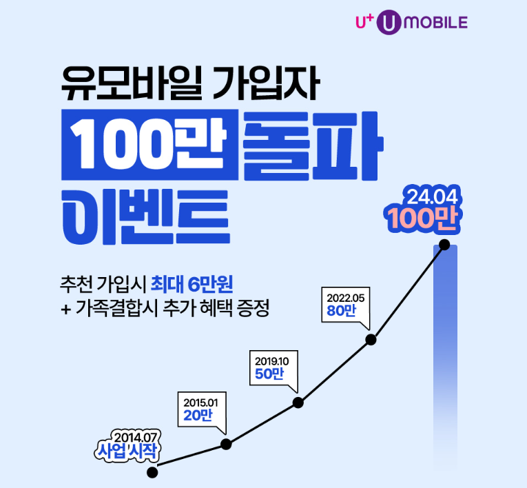 가정의 달 5월을 맞이해 진행 중인 이벤트도 풍성한데요, 그중에서도 유모바일 가입자 100만 돌파 기념 이벤트가 진행되고 있어 눈여겨볼만합니다. 추천 가입 시 되채 6만 원의 혜택과 함께 가족 결합 시 추가 혜택인 데이터 증정까지 준비되어 있어 부족함 없는 통신서비스를 이용할 수 있으니 통신비는 줄이고 토탈 라이프케어 서비스를 준비하고 있다면 유모바일에서 해결해 보시기 바랍니다.