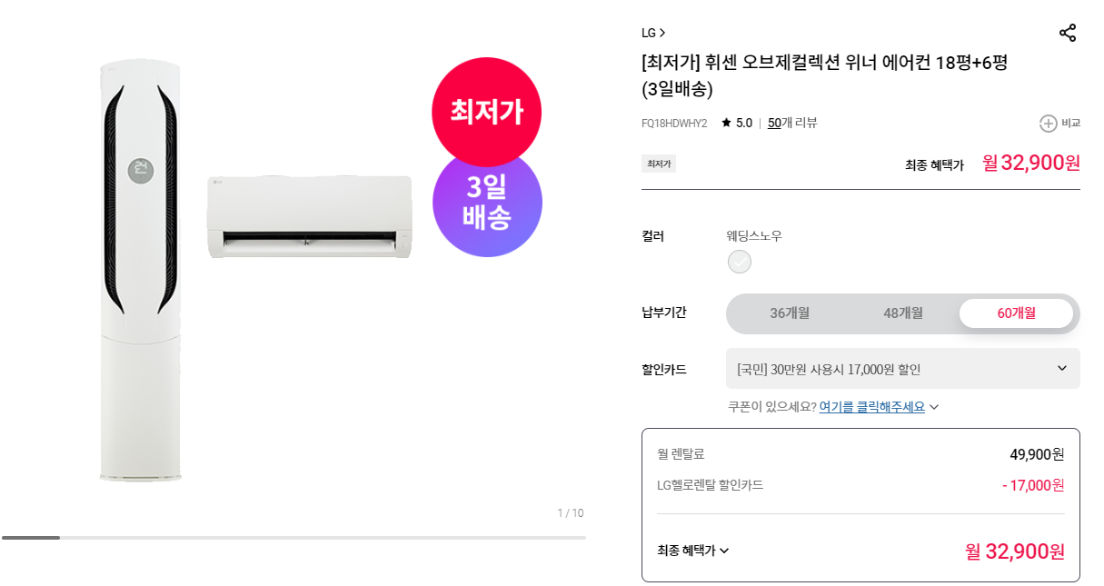 에어컨 렌탈을 더 이상 망설이면 안 되는 이유 바로 LG헬로비전에서 최저가 이벤트가 시작되었기 때문입니다. 24년형 제품도 포함된 대박이벤트라고 할 수 있는데요, 최저가 보장에 3일 배송보장이 더해졌습니다. 여기에 기본 설치비도 무상으로 제공되고 할인카드까지 이용하면 같은 제품이라도 더 좋은 조건으로 렌탈하는 곳은 찾기 어려울 것으로 생각됩니다.