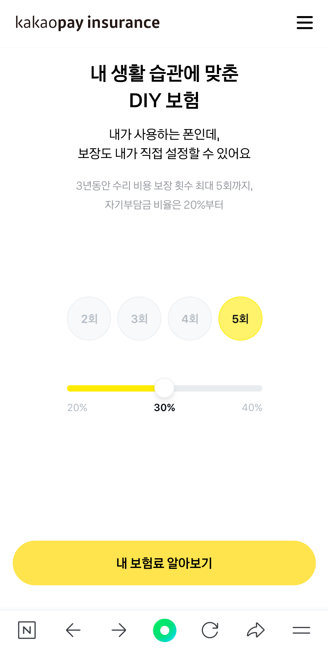 보험료를 산정하는 부분도 3년동안 수리 비용 보장 횟수를 2회부터 최대 5회까지 원하는대로 설정 가능하며, 자기부담금 비율은 20%부터 최대 40%까지 원하는 조건으로 설정할 수 있습니다. 평소 휴대폰 이용시 염려하던 부분들을 고려해 가입할 수 있어 부담을 줄일 수 있는점도 카카오페이손해보험 휴대폰보험의 장점입니다.