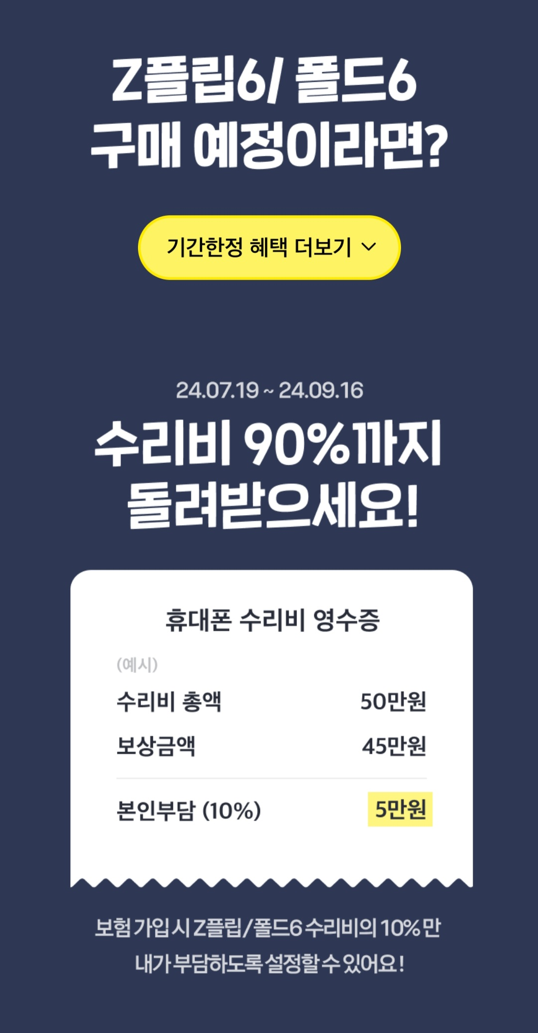 갤럭시 폴드6 또는 Z플립6 구매 예정인원이라면 누구나 휴대폰보험 사전예약 이벤트에 참여할 수 있는데요, 이벤트 참여시 수리비를 90% 까지 돌려 받을 수 있는 조건을 설정할 수도 있는 만큼 기기변경을 고민 중이라면 눈여겨보고 결정해보시기 바랍니다. 이외 기종도 가입가능하나 기종별로 보험료가 다르기 때문에 비용이 궁금하다면 카카오페이손해보험에 접속해 보험료를 확인해보시고 결정해보시기 발바니다.