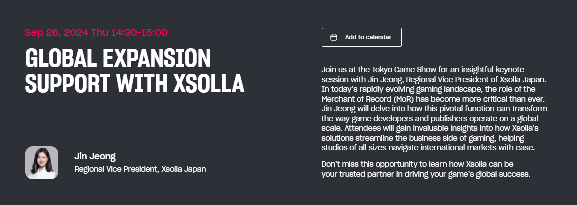 도쿄 게임 쇼 2024가 진행되는 동안 정진 엑솔라 지역 부사장이 엑솔라의 Merchant of Record (MoR) 솔루션이 게임 회사들이 고민하는 해외 거래, 세금, 규제 복합성을 처리하는 방식을 어떻게 변화시키는지에 대한 주요 세션을 진행할 예정입니다.