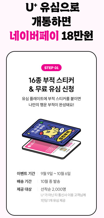 무너부적 이벤트를 재미로 즐길 수도 있지만 참여와 함께 놓칠 수 없는 이벤트도 준비되어 있습니다. 무료유심을 신청하면 부적 스티커 16종을 받을 수 있어 유심 플레이트에 부적 스티커를 붙여 나만의 행운 부적을 만드는 즐거움도 누릴 수 있습니다.