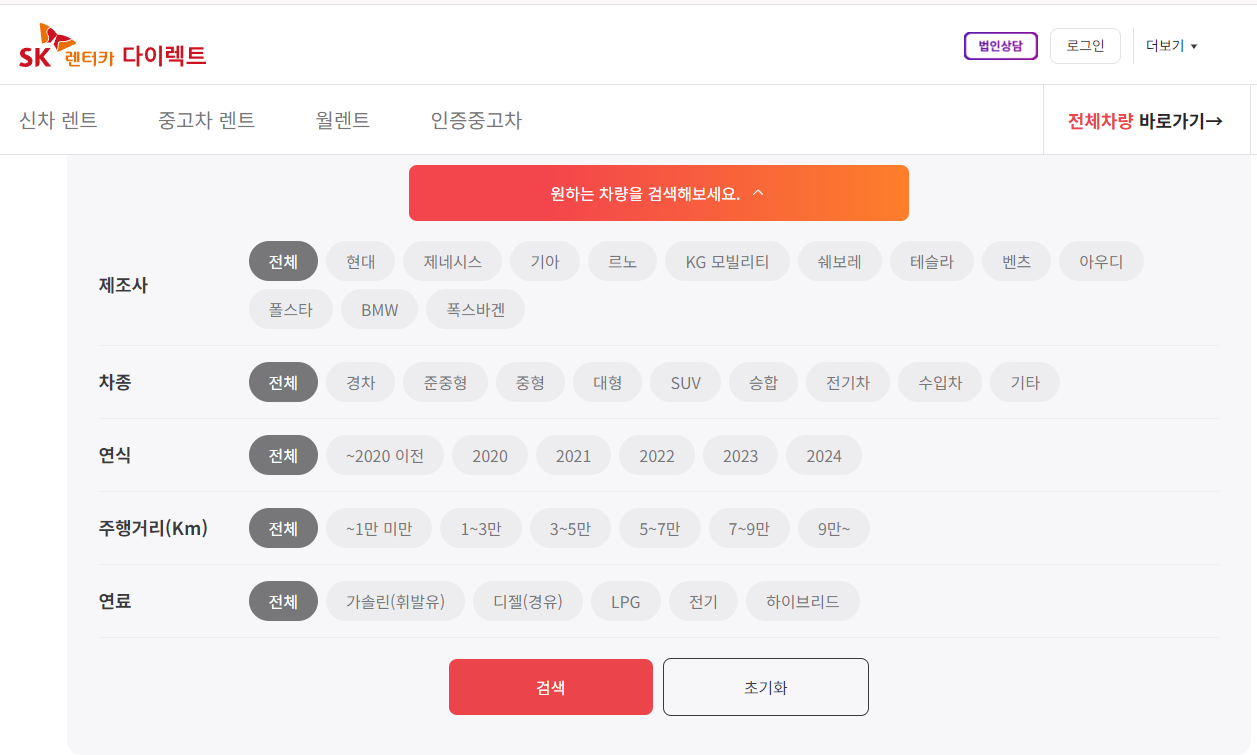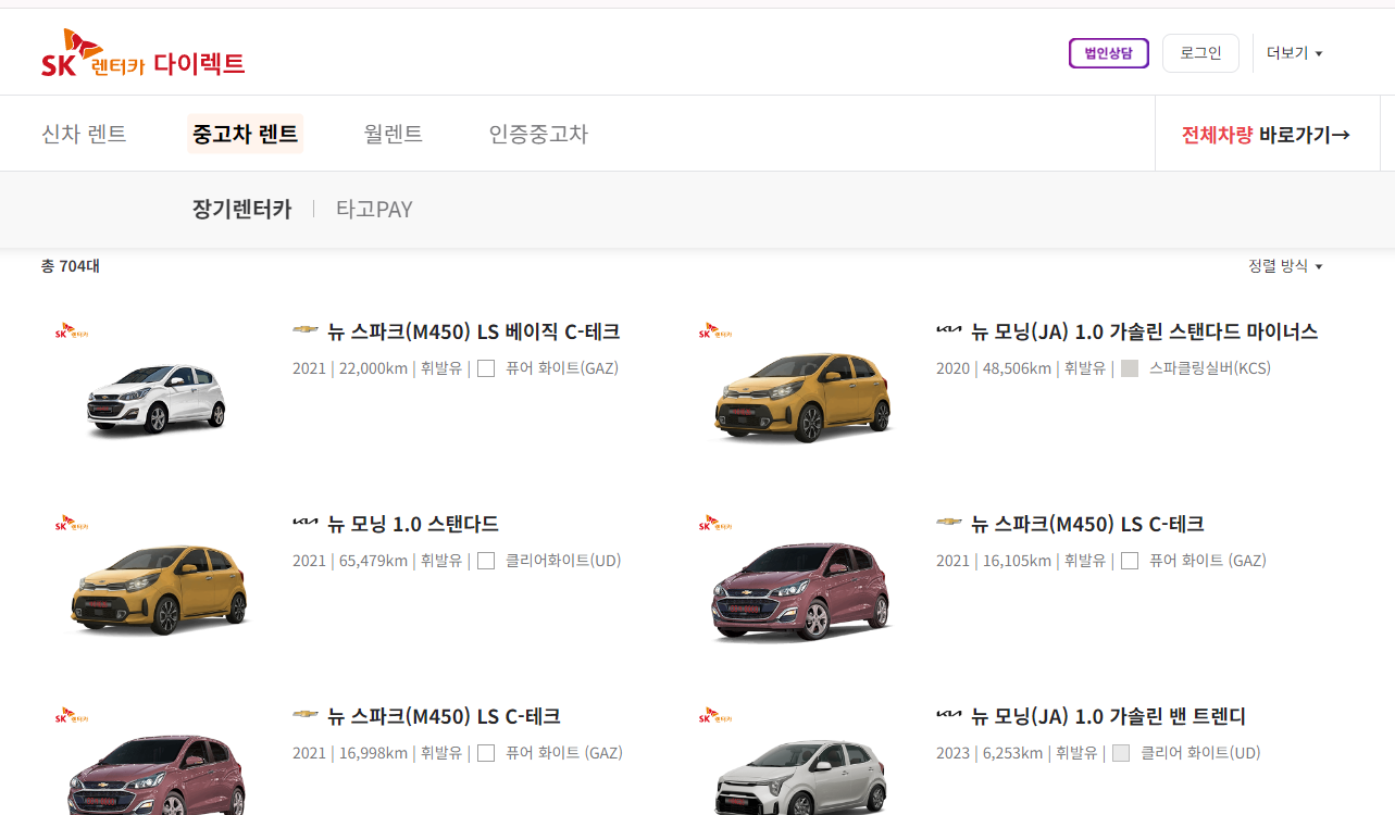 SK중고차장기렌트에서 차량을 선택하고 계약하는 방법도 간단합니다. 다이렉트 사이트에 접속 후 상단 메뉴에서 중고차 렌트를 선택하면 렌트 가능한 차량들을 확인할 수 있는데요, 차량 연식, 주행거리, 가격등 원하는 조건으로 구비된 차량을 확인 가능합니다.