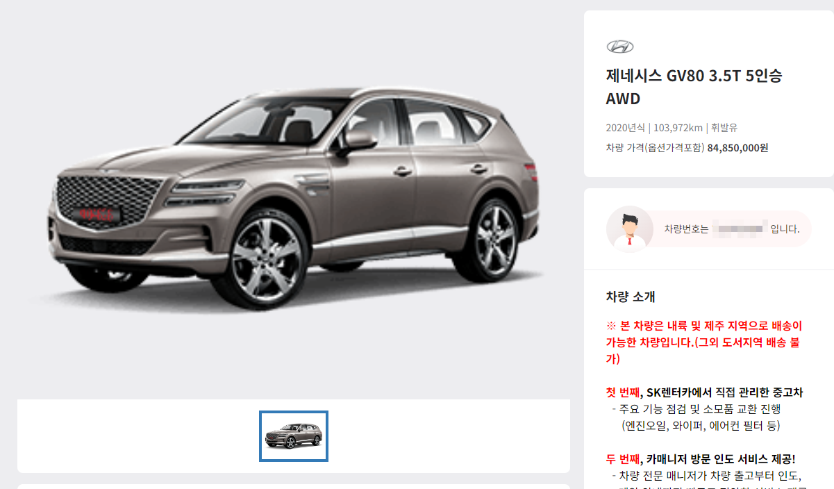 인증 절차를 진행한 후 차량에 대한 보다 자세한 정보를 확인할 수 있는데요, 연식과 주행거리 그리고 옵션가를 포함한 차량가격부터 차량 번호 및 기본 사항들까지 한눈에 파악하고 다음으로 넘어갈 수 있습니다.