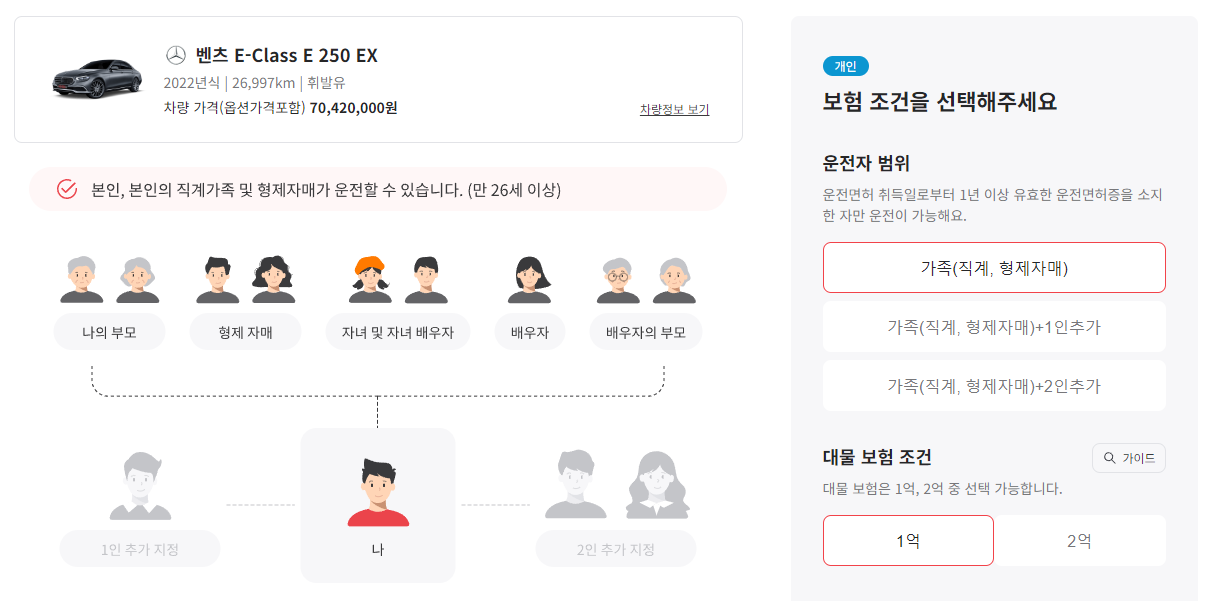 운전자 범위와 대물보험 조건도 선택해야 합니다. 운전자 범위는 운전면허 취득일로부터 1년 이상 유효한 운전면허증을 소지한 자만 운전 가능한데요, 직계가족과 형제자매를 기본으로 최대 1인 추가 지정이 가능하고, 대물 보험도 1억과 2억중 선택이 가능합니다.