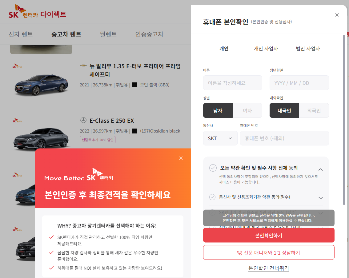 낮은 주행거리와 연식을 고려해 확인하다 마음에 드는 차량을 발견했는데요, 본인인증을 진행한 후에 최종 견적을 확인할 수 있었습니다. 본인확인을 건너뛰고 확인할 수 있으나 가격 혜택이 적용되지 않기 때문에 정확한 비용 확인을 위해선 본인인증을 필수로 진행해야 합니다.