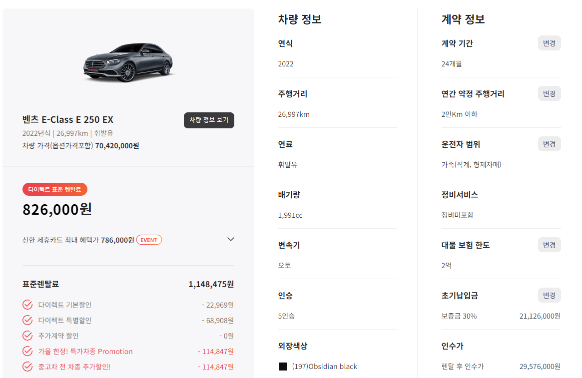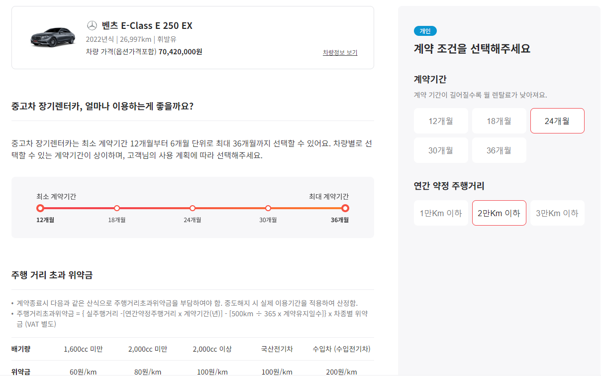 해당 차량에 대한 기본 조건들도 마음에 들어 비용을 계산해보았는데요, 최종 계산에 앞서 계약기간과 연간 약정 주행거리를 선택해야 합니다. 렌트비용의 경우 계약기간이 길 수록 월 렌탈료가 낮아지지만, 연간 약정 주행거리를 초과하면 추가 거리에 대해 위약금이 적용되기 때문에 신중하게 선택해야 합니다.