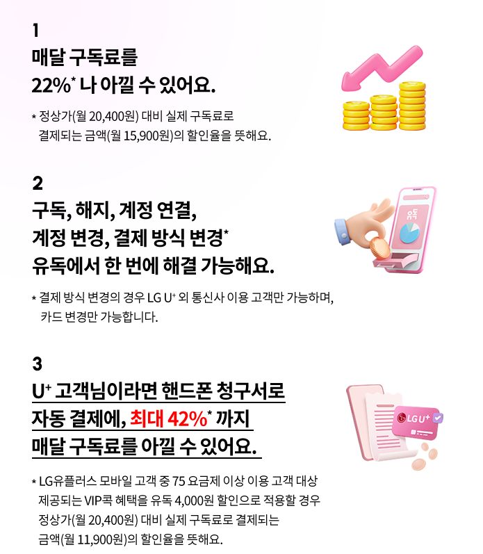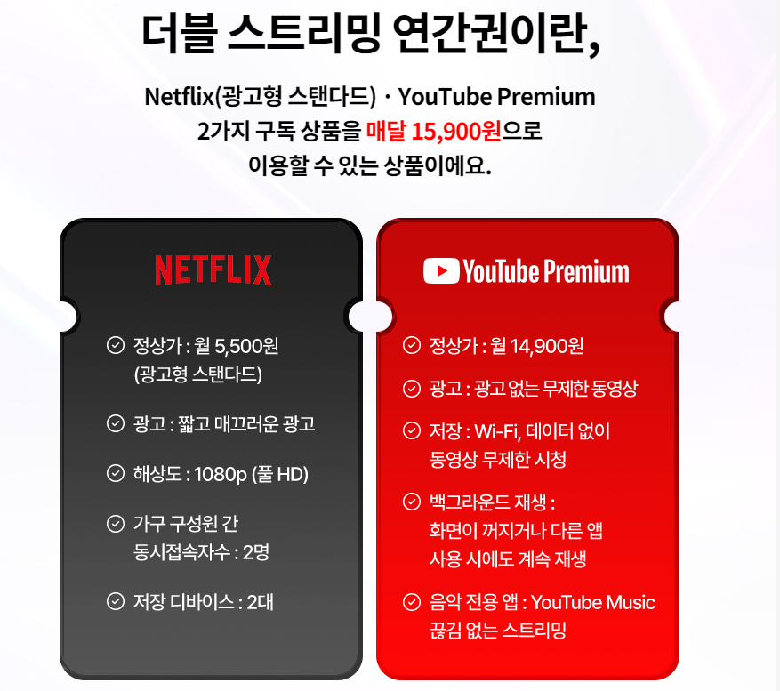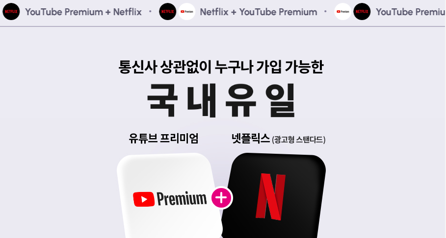 유독 더블 스트리밍 서비스 구독은 유플러스 가입자가 아니더라도 누구나 가입할 수 있다는 점도 놓칠 수 없습니다. 통신사 상관없이 넷플릭스와 유튜브 프리미엄 조합 구독이 가능해 혜택을 받을 수 있기 때문에 통신사가 어디라도 고민할 필요가 없는만큼 비용은 절약하고 꿀조합 서비스를 받고 싶은 분들이라면 꼭 챙기는 걸 추천드립니다.