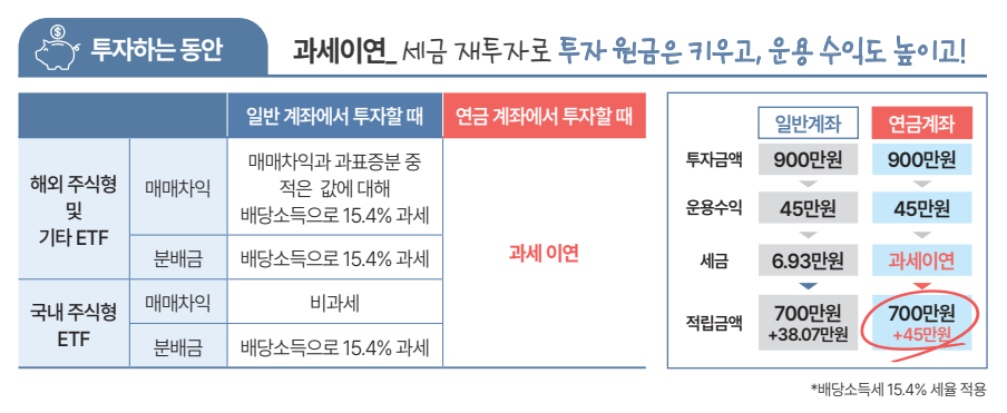 납부한 비용을 투자하는 동안 받을 수 있는 혜택도 있습니다. 일반계좌에서 투자할 경우 조건에 따라 매매차익과 분배금에 대한 배당소득 15.4%가 과세되는 부분에 있어 연금계좌에서 투자할 경우 과세이연이 적용되어 당장 세금을 납부하지 않아도 됩니다.