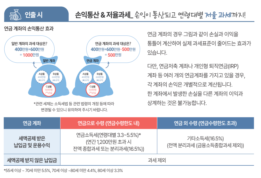 인출 시 받을 수 있는 혜택도 있습니다. 일반계좌의 경우 상품에 따라 수익과 손실을 상계하지 않고 수익에 대한 과세를 하게 되는데요, 연금 계좌는 계좌로 인해 발생한 수익과 손실을 합산해 최종 수익을 계산하기 때문에 실제 과세표준을 낮춰 세금을 줄일 수 있습니다. 여기에 연령대별 저율과세가 적용되어 혜택을 받을 수 있어 꼼꼼하게 챙겨야 합니다.