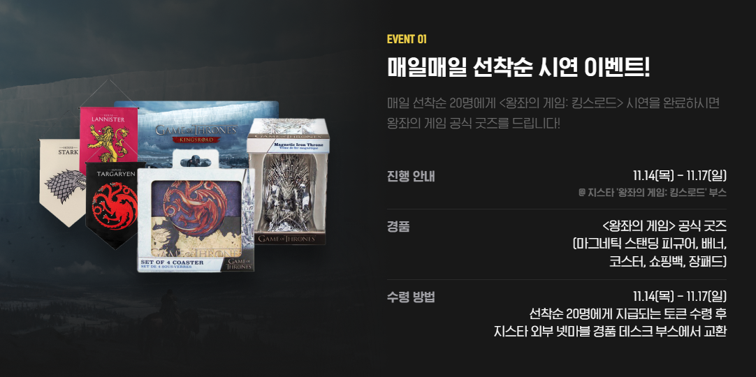넷마블 부스에서 참여 가능한 게임 이벤트도 놓칠 수 없습니다. 왕좌의 게임: 킹스로드는 선착순 시연 이벤트와 스탬프 미션 이벤트 그리고 무대이벤트가 준비되어 있는데요, 참여한 분들에게는 왕좌의 게임 공식 굿즈를 비롯해 무선 게이밍 헤드셋, 지포스 RTX 4070 SUPER D6X 12GB 등 푸짐한 선물을 받을 수 있는 기회가 주어집니다.