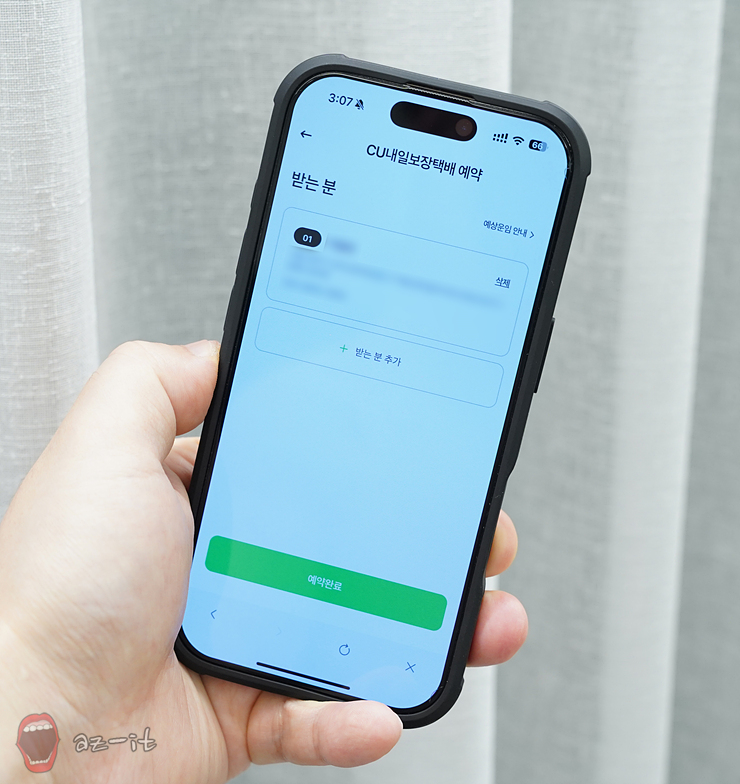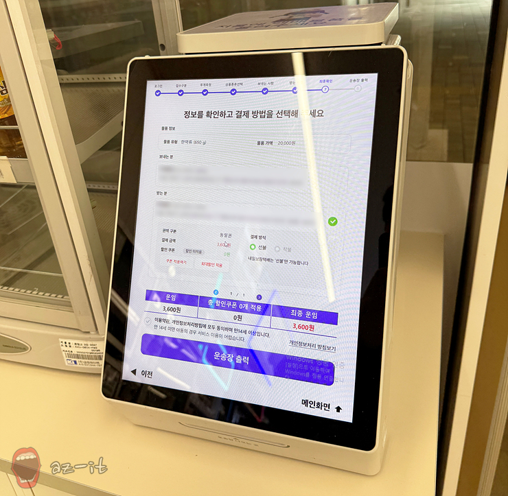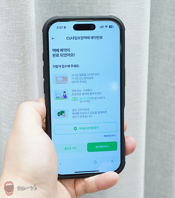 CU편의점 한쪽에 위치한 기기입니다. 현장접수와 예약접수 모두 가능한데요, 현장접수의 경우 사람 많은 편의점 안에서 제품부터 보내는사람과 받는 사람 정보를 일일이 기재해야 해서 시간도 오래 걸리는 만큼 예약접수를 선택하면 앱으로 미리 기재한 정보를 한 번에 불러올 수 있어 세상 편합니다.
