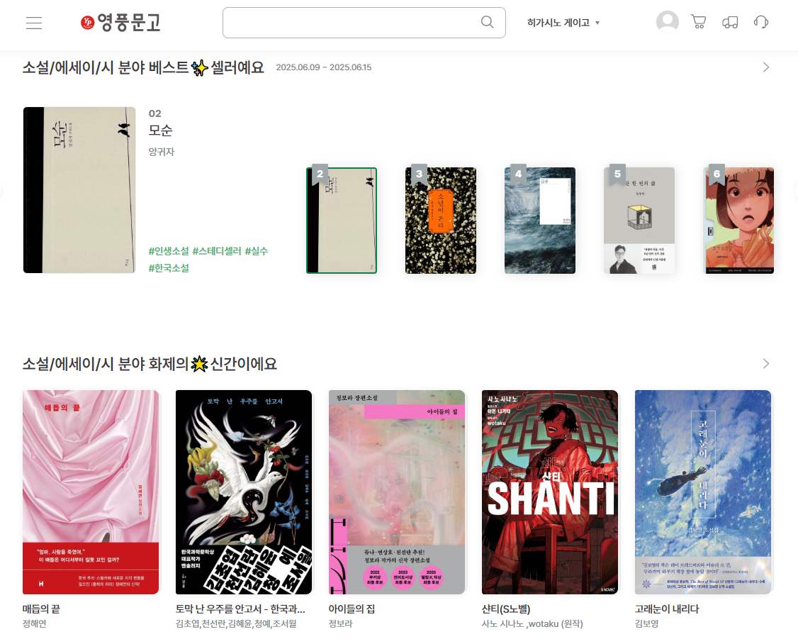 충전한 영풍문고 e캐시는 홈페이지 어디에서든 이용할 수 있습니다. 베스트 소설을 비롯해 에세이등 도서 구매시 이용도 가능하고, 선물샵이나 컬처페이지에서도 원하는 상품을 선택하고 결제 시 이용 가능합니다. 읽어보고 싶었던 책이 있거나, 참여하고 싶었던 클래스가 있다면 보유하고 있는 문화상품권을 영풍문고 e캐시로 전환해 사용해 보시는 걸 추천드립니다.