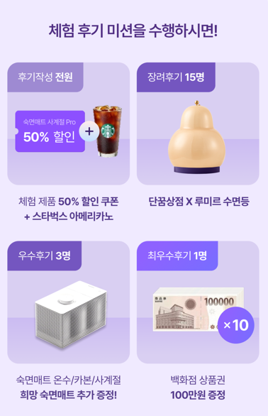 한여름 나비엔 숙면매트 사계절 ProPro를 체험할 수 있는 것도 마음에 들지만 체험 후기 미션을 수행하면 주어지는 혜택도 상당합니다. 후기만 작성해도 체험제품 50% 할인 쿠폰과 스타벅스 아메리카노를 지급하고, 장려후기 15명에게는 단꿈상점 x루미르 수면등을 선물로 증정합니다. 우수후기 3명과 최우수 후기 1명에게 주어지는 선물도 상당한데요, 나비엔 숙면매트 사계절 Pro 제품이 욕심난다면 우수후기에 도전해 보아도 좋을 것 같습니다.