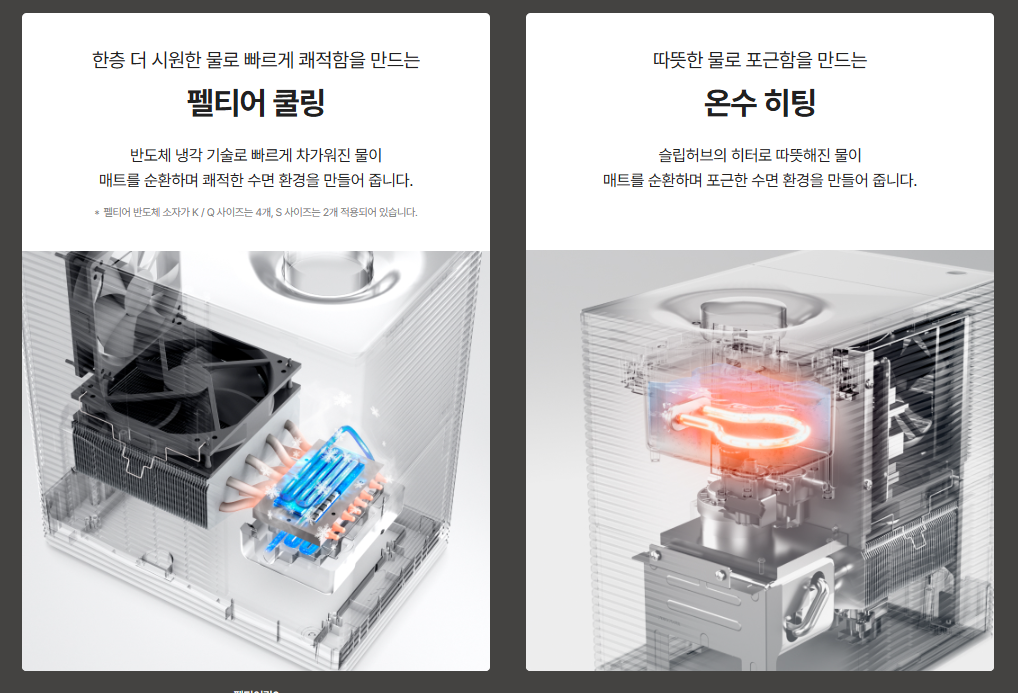나비엔 숙면매트 사계절 Pro는 날이 더울 땐 펠티어 쿨링 시스템으로 차가워진 물이 매트를 순환해 쾌적한 수면 환경을 만들어주고, 추울 땐 슬립 허브릐 히터로 따듯해진 물이 매티를 순환해 포근한 수면환경을 만들어 주기 때문인데요, 계절에 따라 매트를 사용했다가 보관하는 번거로움 없이 사계절 내내 이용 가능한 부분도 편리합니다.
