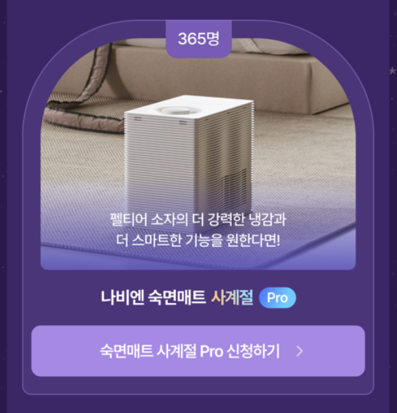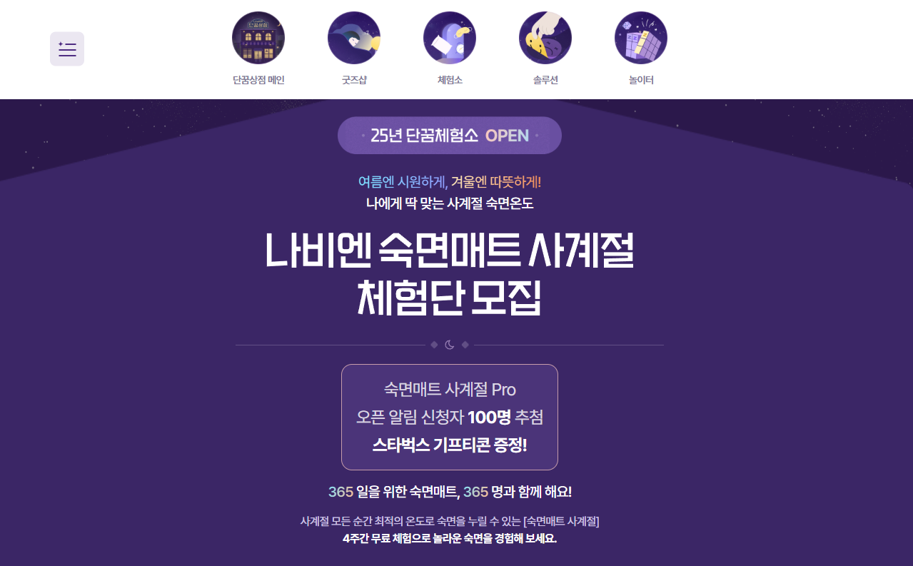 사계절 내내 숙면을 취할 수 있도록 만들어 주는 나비엔 숙면매트 사계절 Pro를 사용해 보고 싶다면 지금 단꿈상점에서 진행되는 대규모 체험단 모집에 참여해 보는 건 어떨까요? 365일을 위한 숙면매트라는 슬로건에 맞춰 총 365명에게 4주간 무료로 체험할 수 있는 체험단 참여가 가능합니다.