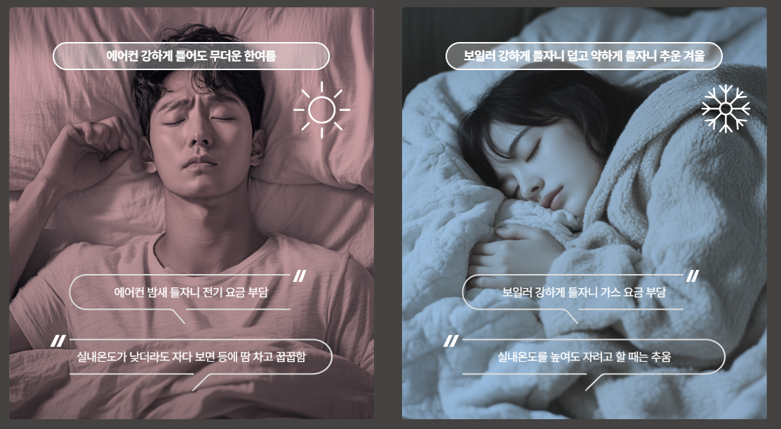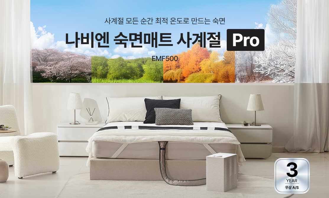 아마 많은 분들이 계절에 따라 달라지는 온도와 습도 때문에 숙면을 취하지 못해 온수매트나 쿨링매트등 여러 방법을 활용하는 걸로 알고 있습니다. 저 역시 마찬가지였으니 말이죠. 하지만 매번 달라지는 환경 때문에 최적의 잠자리를 만드는 게 쉽지 않았던 반면 나비엔 숙면매트 사계절 Pro 하나만 있어도 이런 고민은 하지 않아도 될 정도입니다.