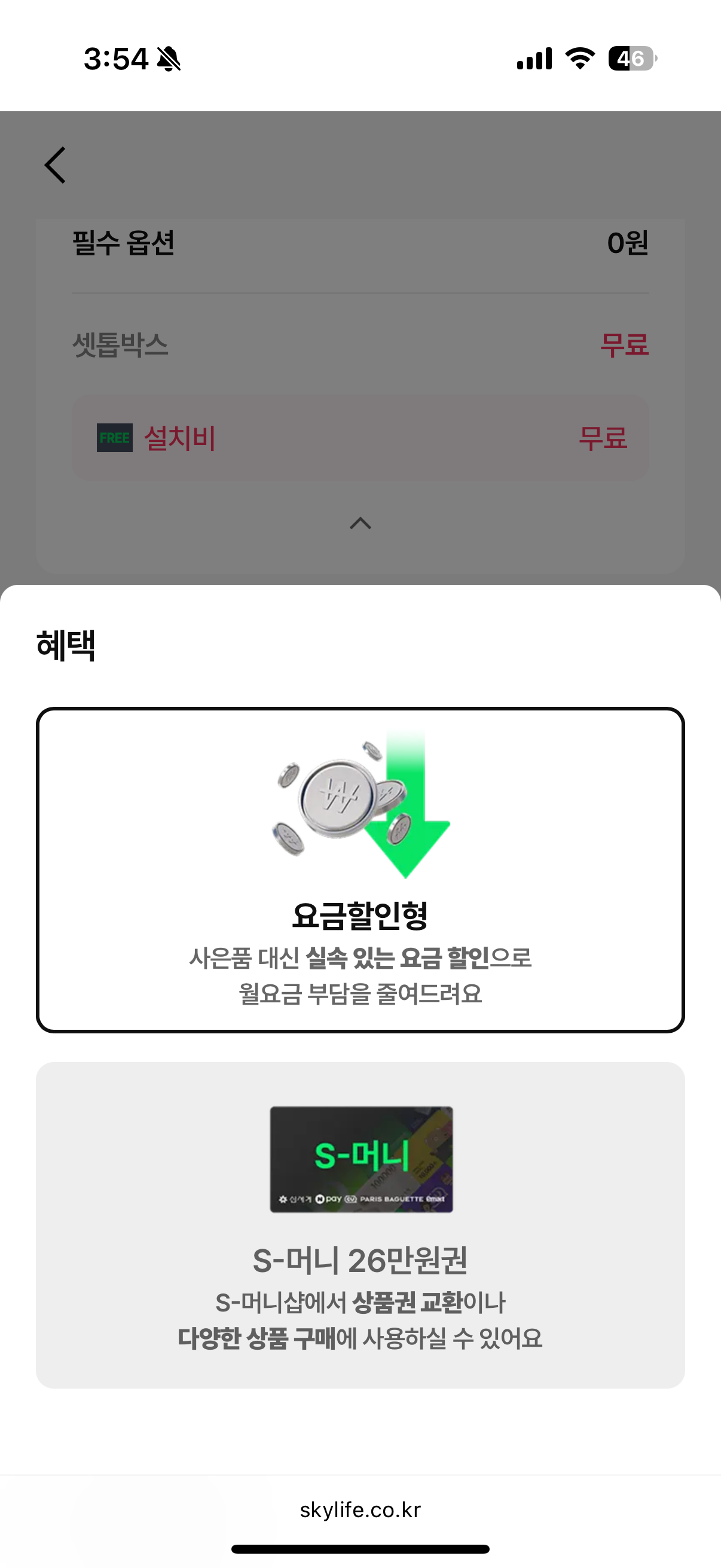 원하는 옵션을 선택했다면 이제 혜택과 할인카드 적용 선택이 필요합니다. 혜택은 요금할인형과 S머니 36만 원 두 가지 혜택 중 선택이 가능해 실속 있는 요금 할인이냐, 상품권을 비롯한 상품을 구매하느냐를 결정하면 됩니다. 이후 할인카드를 선택해야 하는데요, 하나카드/ 국민카드/ 롯데카드 중 하나를 선택할 수 있고 카드발급이 싫은 분들은 카드 할인받지 않기를 선택하면 됩니다.