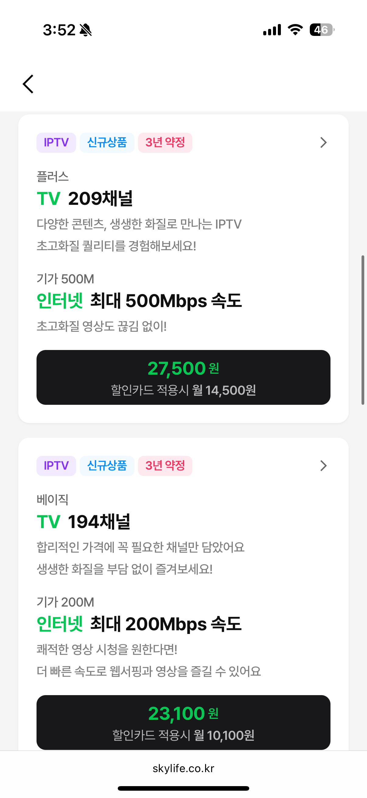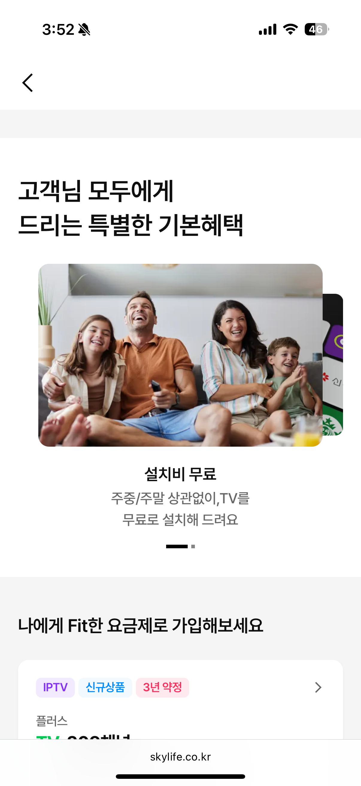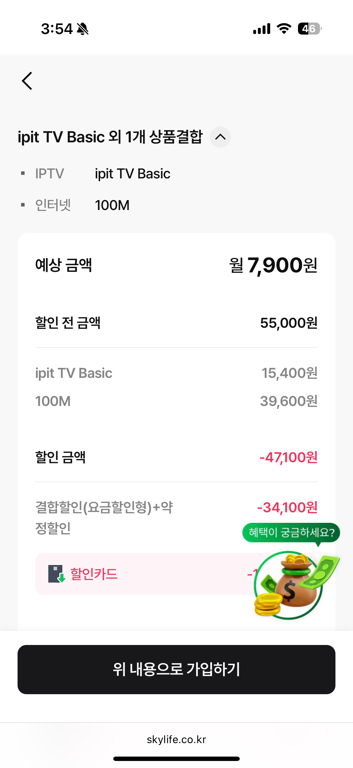 영상 퀄리티도 중요하지만 KT스카이라이프 IPTV 무엇보다 초점을 맞춘 부분 바로 가격입니다. IPTV와 인터넷을 더한 가격이 9,000원(할인카드 적용 시)부터 시작하는데요, 전국형 IPTV 중에서 가장 저렴한 가격으로 이용 가능한 금액입니다. 평생 요금 3년 기준으로 계산해 보면 최대 146만 원의 할인을 받는 셈입니다. 대박이지 않나요?