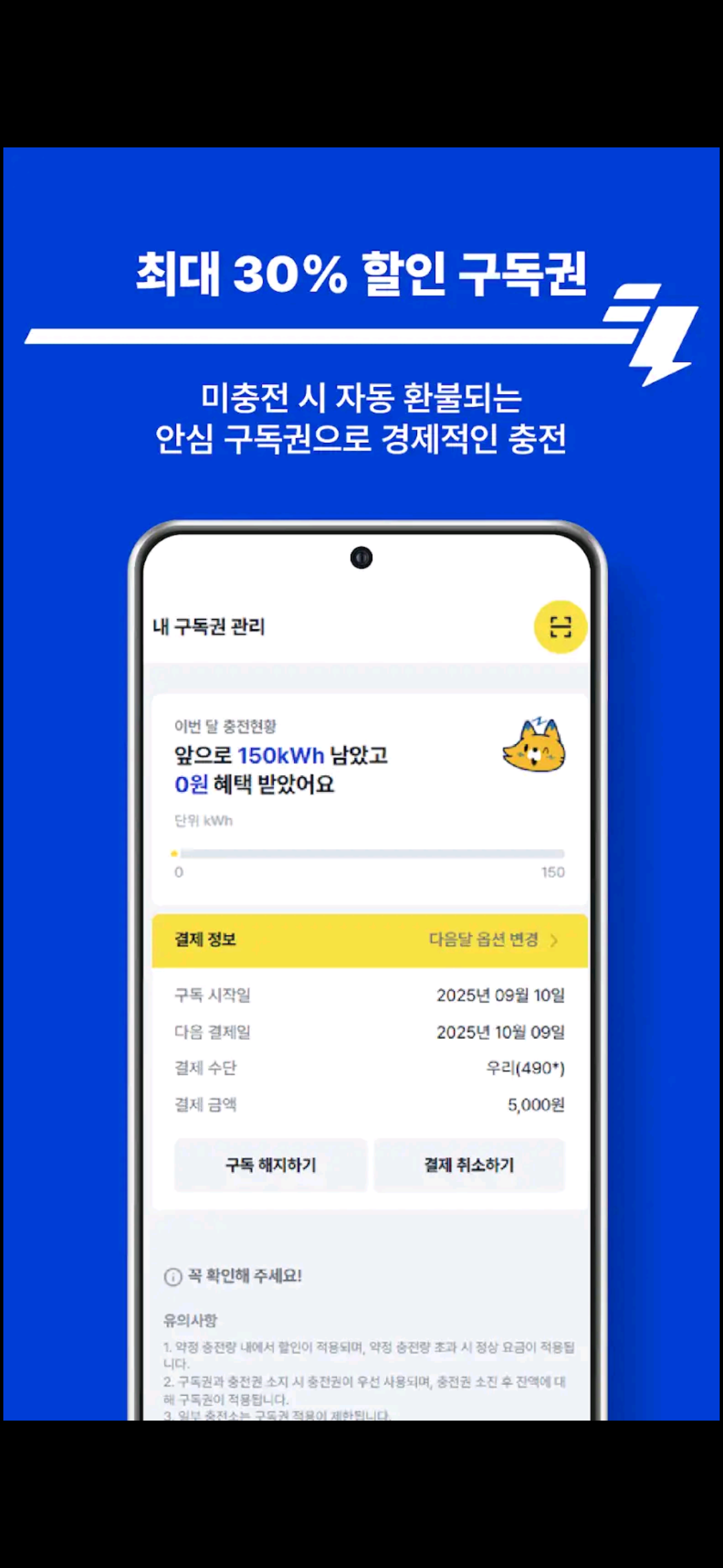 또한, 구독권 구매 시 제공되는 할인 혜택도 매우 매력적입니다. 전기차 충전 시 최대 30% 즉시 할인을 받을 수 있으며, 한 달 기준으로 최대 14만 원 상당의 절감 효과를 누릴 수 있습니다. 여기에 미사용 시 자동 환불 시스템까지 갖추고 있어, 경제적인 측면에서도 단연 돋보입니다.