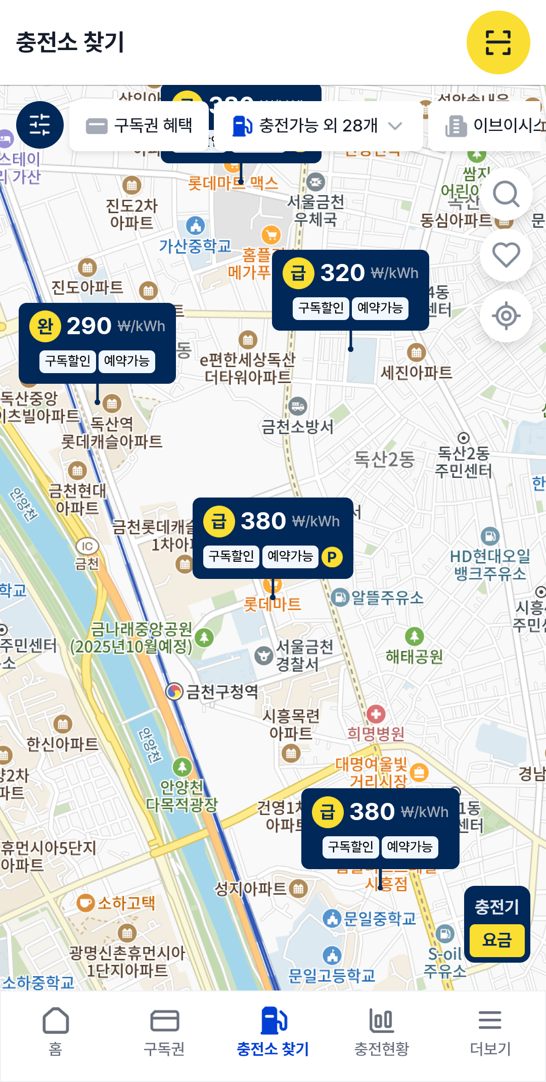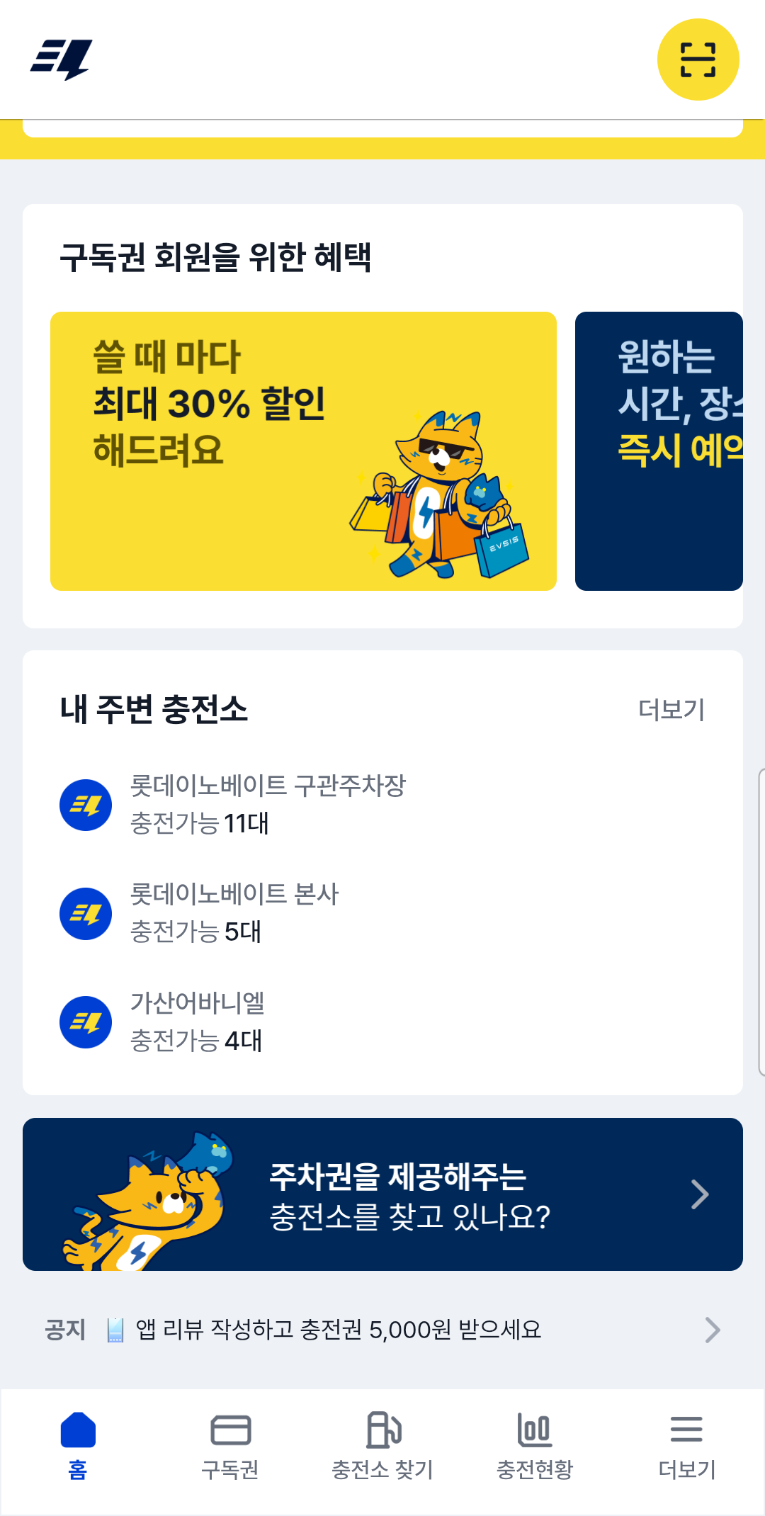 지도 마커에서 충전기, 요금 정보 확인도 가능하고, 구독 할인 적용 여부와 예약 가능 여부 체크도 가능하도록 업데이트 되어 훨씬 이용하기가 편해졌습니다. 무엇보다 주차권제공이나 다양한 서비스를 한눈에 확인할 수 있도록 구성되어 이것저것 확인하고 비교하지 않고 사용 할 수 있어 부담이 없습니다.