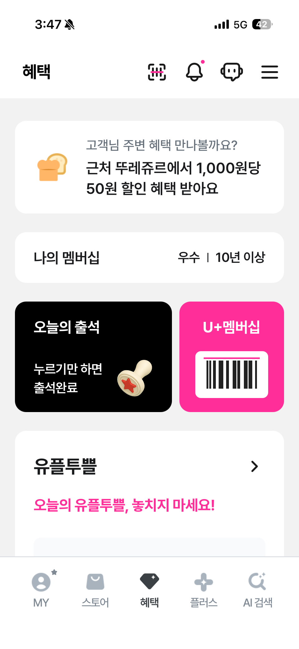 유플러스 이용자라면 놓치면 안되는 혜택이라던가 흥미로운 AI 트렌트, 회사와 고객이 함께하는 이야기 등 유용한 콘텐츠를 제공하는 플러스 메뉴도 추가되었습니다. 그동안 몰라서 챙기지 못했던 혜택들. 유플러스를 사용하는 다른 이용자의 이야기는 앞으로 플러스를 통해 한번에 챙길 수 있게 되었습니다.
