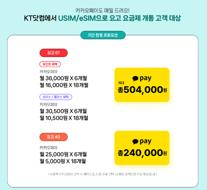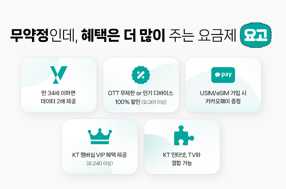 KT 요고 요금제는 무약정에 가성비 최고이면서 할인 혜택은 가득한 요금제입니다. 특히 만 34세 이하인 분들은 데이터를 2배 제공하고 있어 대박이라고 할 수 있습니다. 월 2만 원대 5G 완전 무제한 요금제 선택이 가능하고 OTT 무제한 or 인기 디바이스 100% 할인과 KT 멤버십 VIP 혜택 그리고 인터넷, TV 결합 시 추가 할인이 가능해 지나치기 아쉬울 정도입니다. 특히 USIM/eSIM 개통 고객 한정 카카오페이 포인트 혜택까지 챙길 수 있답니다.